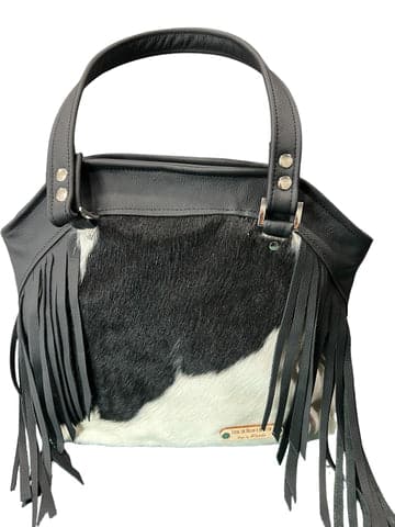 The “Peaceful” Shoulder Bag is a stunning blend of style, function, and durability. Crafted with black and white hair-on hide and premium leather, this bag is as eye-catching as it is practical. The exterior features a convenient phone and key pocket on the back, along with left and right access to the concealed carry zipper compartment. When not in use for carrying, this compartment serves as an additional pocket for extra storage. The interior is lined with waterproof canvas, offering unmatched durability that won’t tear and is easy to clean. Inside, you’ll find a slip pocket on one side and a zippered pocket on the other, providing ample room to keep your items organized. Designed to stand upright, the bag includes purse feet to protect it from touching the ground. A secure zippered top closure keeps your belongings safe, while the 28-inch handles allow for comfortable shoulder wear, whether you’re in a tank top or bundled up in a heavy coat. This one-of-a-kind bag offers the perfect combination of elegance, utility, and comfort—an everyday essential you’ll love for years to come. Measurers: 15 1/25”w x 12”t x 5 1/2”d